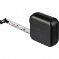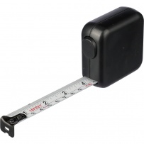 Miara o długości 5 metrów w centymetrach i calach, blokada przyciskowa poprawiająca komfort użytkowania oraz umożliwiająca samodzielne mierzenie, zapakowana w brązowy kartonik, produkt wykonany z ABS