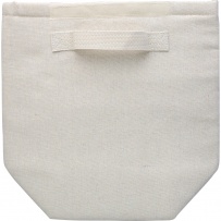 Cooler bag small front pocket, hook and loop closure, includes recycled cotton icon on the product, short handle to carry in hand, product made from recycled cotton, PEVA, EPE
