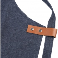 Fartuch kuchenny z denimu, do noszenia na ramionach poprzez włożenie pasków w dołączone szlufki z boku, 2 przednie kieszenie z przodu, zapakowany w brązowy kartonik, produkt wykonany z denimu, bawełny 65%/35%, poliestru o gramaturze 280 g/m2
