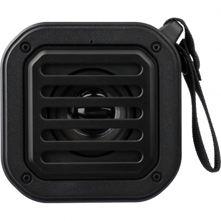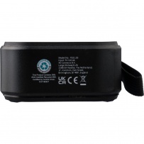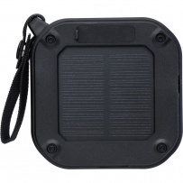 Wireless speaker, IPX6 which means protection against water jets for 3 minutes, wristband and carabiner for attaching, output power 3 W, DC 5 V input, built-in 400 mAh battery, works at a distance of 15-20 meters from the signal source, signal ratio to noise 75 dB, 100 Hz-20 K Hz frequency, includes 30 cm length type C charging cable, built-in LED flashlight (30 lumens), solar panel extending the use time, 4 hours of playing time, BT 5.3, packed in a brown carton box, product made from recycled ABS, PVC