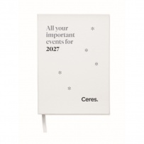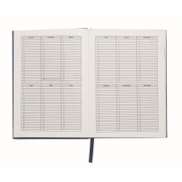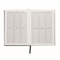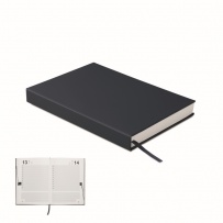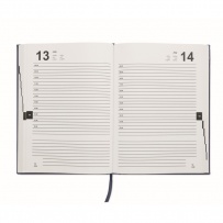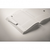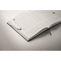A5 daily diary notebook in 60% recycled post consumer polyester and 40% PU cover. 416 universal pages in 70gsm recycled paper (208 sheets). With matching colour polyester ribbon page marker.