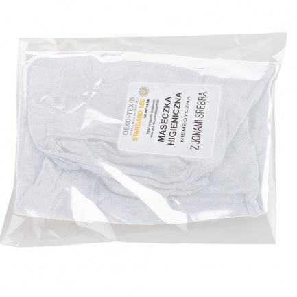 Maseczka wielokrotnego użytku z jonami srebra, niemedyczna, dwuwarstwowa, posiada miejsce na filtr, wykonana w 100% z poliamidu 250 g/m2, jony srebra utrzymują się do 20 prań, temperatura prania do 90 stopni Celsjusza, posiada certyfikat OEKO-TEX Standard 100 (wyprodukowana w Europie / made in Europe)