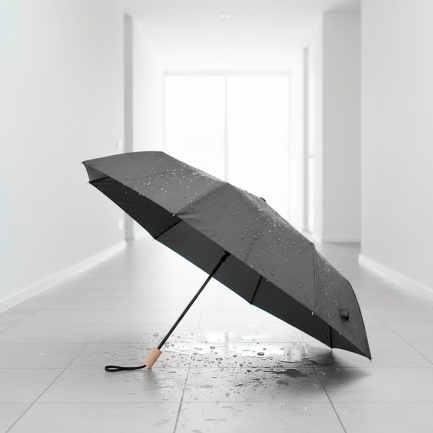 Parapluie manuel coupe-vent en RPET, pliable, 8 panneaux, poignée en bois, armature métallique, sangle Velcro, housse assortie incluse.