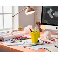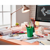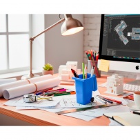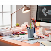 Pen holder with wheels in the shape of a container, with lid and matte finish, product made of PP
