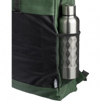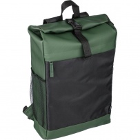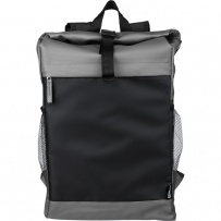 Roll-top laptop backpack with adhesive closure, 5 pockets including one for a 15" laptop, load capacity: 25 l, load capacity: 15?kg, PU waterproof coating, RPET label on the side, includes RPET icon on the tag, product made of RPET