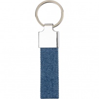 Metal keychain with denim strap for an easier carrying, packaged in craft paper sleeve