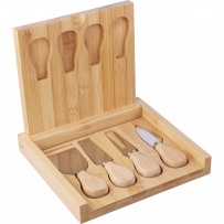 Cheese set, foldable cheese board, 4 cutlery included, convenient storage compartment keeps the cutlery neatly tucked inside, packaged in brown cardboard box, product made of bamboo and metal