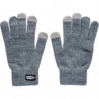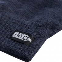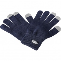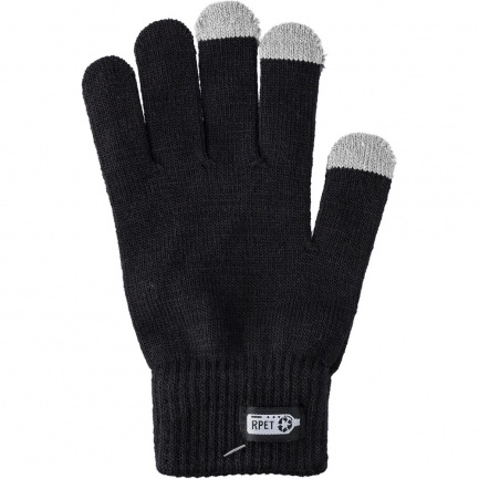 Gloves with 3 special fingertips for touchscreen devices, RPET label on the outside, washing label on the inside, product made of RPET and elastane