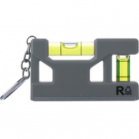 Keychain, magnetic multifunctional tool, size indication on the top, spirit level, ruler, features a magnetic strip on the bottom for attaching to metal surfaces, packaged in brown cardboard box, includes ABS icon on the product, product made of ABS