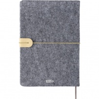 Notizbuch ca. A5, 80 linierte Seiten (70?g/m?), äußerer Gummiriemen, Lesezeichen?Bändchen, Recycling?Symbol, Material: RPET und PU.