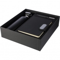 Zestaw upominkowy w ozdobnym pudełku: butelka termiczna ze stali nierdzewnej, podwójne ścianki ze stali nierdzewnej, długo utrzymuje temperaturę nie oddając jej na zewnątrz, wykonana w całości ze stali 304, uchwyt ułatwiający noszenie, długopis posiada wkład w niebieskim kolorze, notatnik 80 kartek w linie (70 g/m?), magnetyczne zamknięcie, grawerowana plakietka, tasiemka zakładkowa umożliwia wygodne zaznaczanie ostatniej strony lub ważniejszych notatek, ikona recyklingu na produkcie na wszystkich produktach, produkt wykonany z RPET