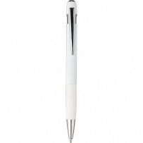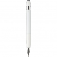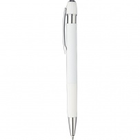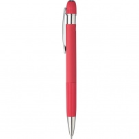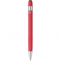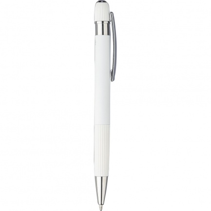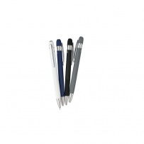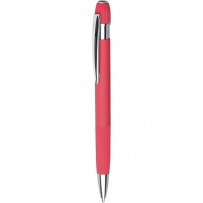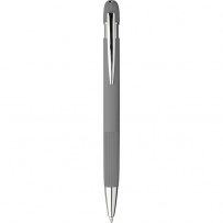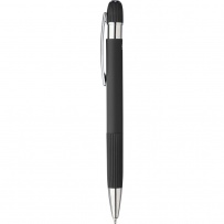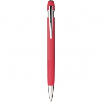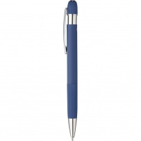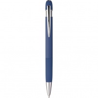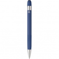 Stylo ? bille en aluminium avec finition caoutchoutée, détails rayés sur la zone de préhension et le dessus, pointe en plastique chromé, bouton-poussoir avec clip métallique, encre bleue, icône recyclage présente sur le produit.