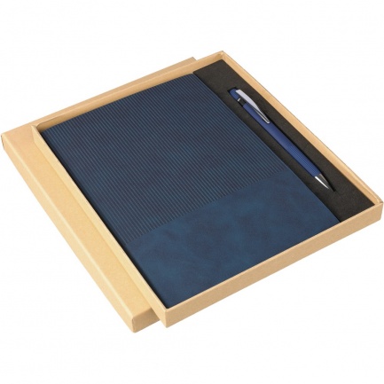 Notatnik ok A5, 100 stron w linie (70 g/m?) z twardą okładką przypominającą sztruks, tasiemka zakładkowa umożliwia wygodne zaznaczanie ostatniej strony lub ważniejszych notatek, długopis w komplecie, gumowe wykończenie, paskowane detale na trzonie i w górnej części, chromowana plastikowa końcówka, ikona recyklingu na obu produktach, zapakowane w brązowe kartonowe pudełko, produkt wykonany z PU i metalu