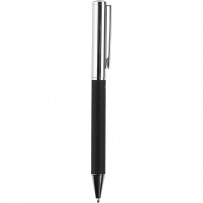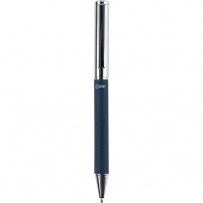 Stylo ? bille ? mécanisme rotatif, fabriqué en métal et RPET, encre bleue, icône RPET présente sur le produit, emballé dans une boîte en carton brun.