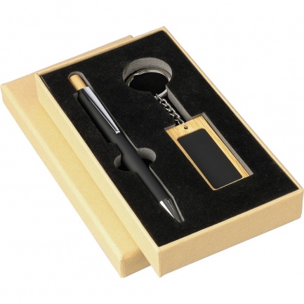 Gift set: ball pen, push button and chromed plastic tip, writes in blue, rectangular keychain, includes recycling icon on both items, packaged in craft paper box with velvet inlay, product made of bamboo, ABS and metal