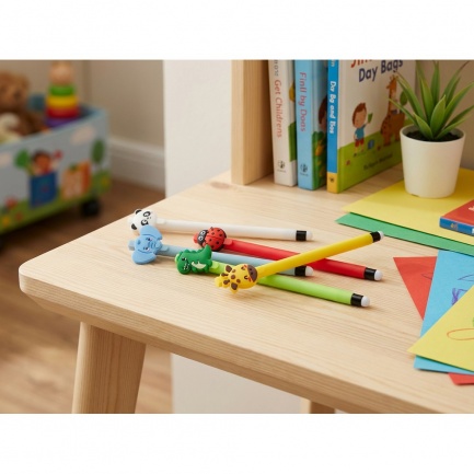 Radierbarer Stift ?Tiere? mit buntem Schaft, erhältlich in 5 verschiedenen zufälligen Motiven: Elefant, Giraffe, Dinosaurier, Panda und Marienkäfer