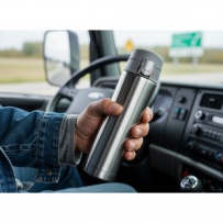 Mug isotherme 450 ml en acier inoxydable ? double paroi avec isolation sous vide, ralentissant le transfert de chaleur et conservant les propriétés thermos, équipé d?un couvercle plat type verrou avec mécanisme d?ouverture ? une main, conception étanche (leakproof)