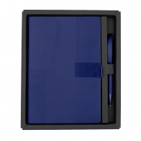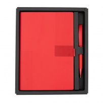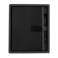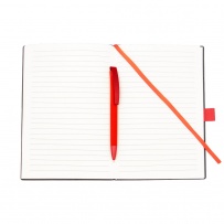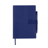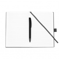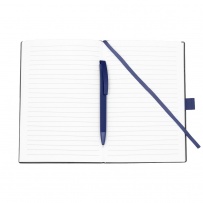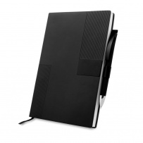 Notatnik w formacie ok. A5 posiada 80 kartek w linie (70 g/m?), tasiemka zakładkowa umożliwia wygodne zaznaczanie ostatniej strony lub ważniejszych notatek, w komplecie długopis typu "twist" z szerokim aluminiowym klipem przeznaczonym do grawerowania, przy szlufce na długopis znajduje się metalowa plakietka do grawerowania, twarda okładka wykonana z PU