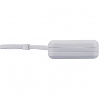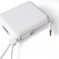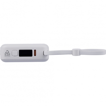 Power bank with 10000 mAh capacity, 22,5W, the set includes a TPE carrying cord (integrated into the housing), which also functions as a charging cable (USB-C and with a tip compatible with iOS devices), battery level indicator on the top of the device, includes RABS icon on the product, USB-C input and output, USB-A input, tissue paper inside the box, no polybag, equipped with overheat, short-circuit, overvoltage and overcurrent protection, individually packed in a brown cardboard box, made from recycled ABS with a lithium-ion battery