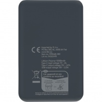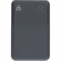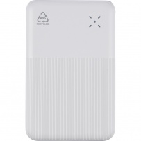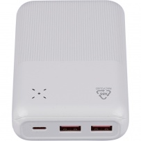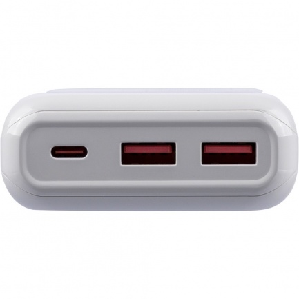 Power bank o mocy 22,5W i pojemności 20000 mAh z baterią litowo-jonową, wejście i wyjście typu C, wejście typu A, etykieta informacyjna z tyłu, ikona RABS na produkcie, posiada zabezpieczenie przed przegrzaniem, zwarciem, przepięciem i przeciążeniem, zapakowany pojedynczo w brązowe kartonowe pudełko, produkt wykonany z ABS z recyklingu