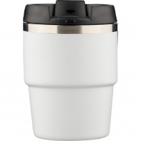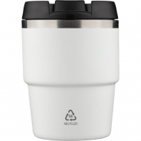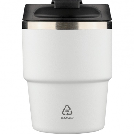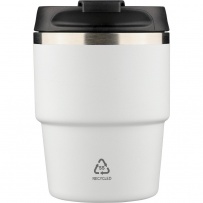 Kubek termiczny 175 ml, posiada podwójne ścianki ze stali nierdzewnej z próżnią między ściankami, co spowalnia oddawanie temperatury na zewnątrz, zachowując funkcje termosu, ikona recyklingu na produkcie, zapakowany pojedynczo w brązowe kartonowe pudełko, produkt wykonany z recyklingowej stali nierdzewnej (wewnątrz 304 / na zewnątrz 201) z pokrywką z PP, utrzymuje temperaturę napojów gorących do 4 godzin