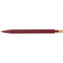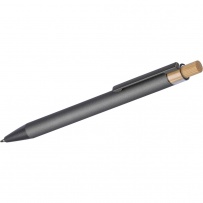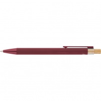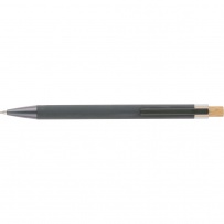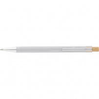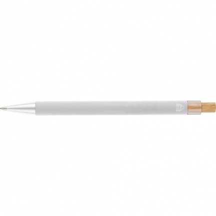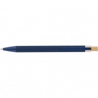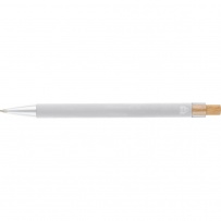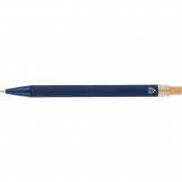 Ball pen, bamboo pusher, metal clip, writes in blue, includes recycled icon on product, approx. 800 m writing length, product made from recycled ABS, bamboo and aluminium