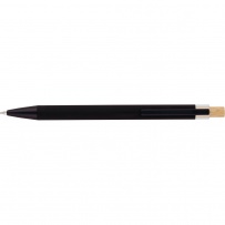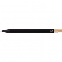 Kugelschreiber, Bambusknopf, Metallclip, Mine in blauer Farbe, Recycling-Symbol auf dem Produkt, reicht für ca. 800 m Schreibstrecke, Produkt aus recyceltem ABS, Aluminium und Bambus