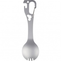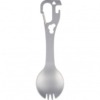 Outil multifonction comprenant : cuill?re, fourchette, ouvre-boîtes et décapsuleur, tournevis plat, trois clés hexagonales, mousqueton pour faciliter l?attache, emballé individuellement dans une boîte en papier, produit fabriqué en acier inoxydable 430