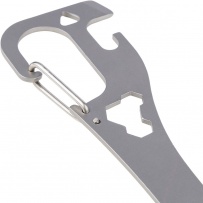 Narzędzie wielofunkcyjne zawiera: łyżkę, widelec, otwieracz do puszek i butelek, płaski śrubokręt, trzy klucze imbusowe, karabińczyk ułatwiający przypięcie, zapakowany pojedynczo w papierowe pudełko, produkt wykonany ze stali nierdzewnej 430
