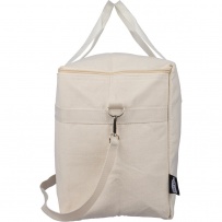 Cooler bag 330 g/m? with a capacity of 23 litres, two carrying handles (3,5 x 60 cm), adjustable strap for carrying the bag on the shoulder (2,5 x 110 cm), metal buckle closing, aluminium foil inside, includes RPET icon on tag, product made from recycled polycotton, aluminium foil and RPET
