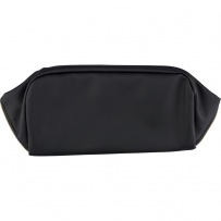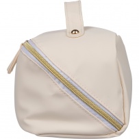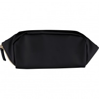 Zippered cosmetic bag, short carrying handle, 210D polyester lining inside, large zippered compartment, small zippered pocket inside, includes recycled icon on a tag, product made from recycled PU and polyester