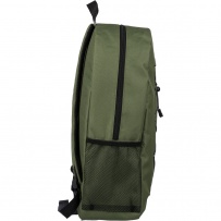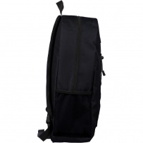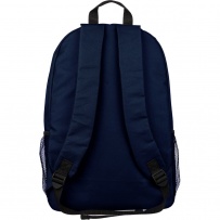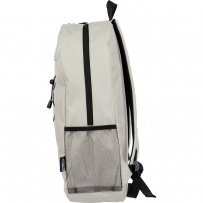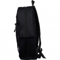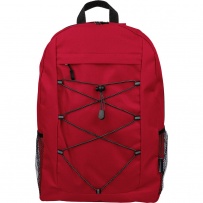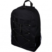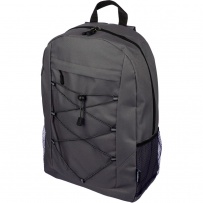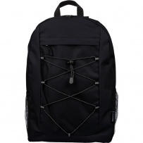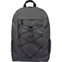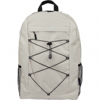 Travel backpack, mesh pockets on each side, elastic bands on the front to attach bottle or blanket, drawstring closing, small, zippered pockets on the front, zippered main compartment, includes RPET icon on tag, the front pocket should be open during printing, product made from RPET, polyester and elastane