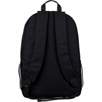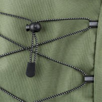Rucksack, Netztaschen auf beiden Seiten, elastische Bänder vorne zum Befestigen einer Flasche oder Decke, Klemmschloss, kleine Reißverschlusstasche vorne, Hauptfach mit Reißverschluss, RPET-Symbol am Etikett, Produkt aus RPET, Polyester und Elasthan