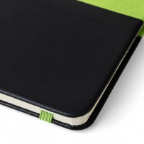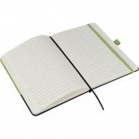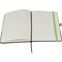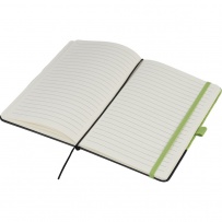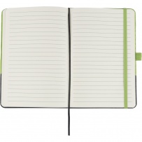 Notizbuch ca. A5, enthält 80 linierte Seiten, 70 g/m˛, Produkt aus RPET und PU.