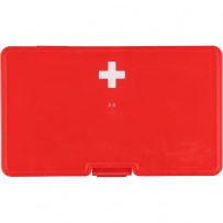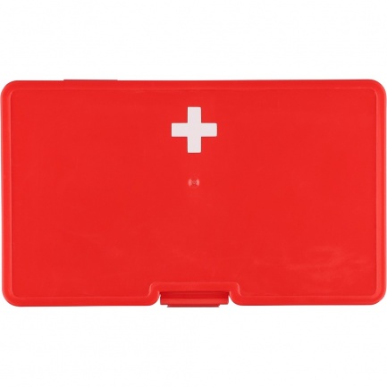 Erste-Hilfe-Set, Verschluss mit Clip, roter Behälter mit weißem Kreuz, Schwämme (2 Stück), Verbände (5 Stück), mit Alkohol getränkte Tupfer (4 Stück), Schere, Verbandrolle (450 cm), Band (450 cm), Produkt aus PP, PE und Polyester
